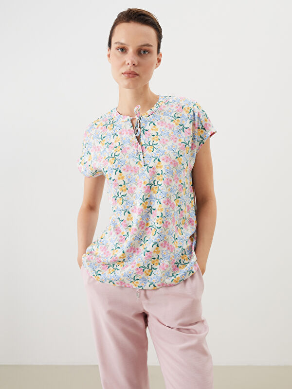 Дөңгелек мойынды өрнектелген мақтадан жасалған блуз