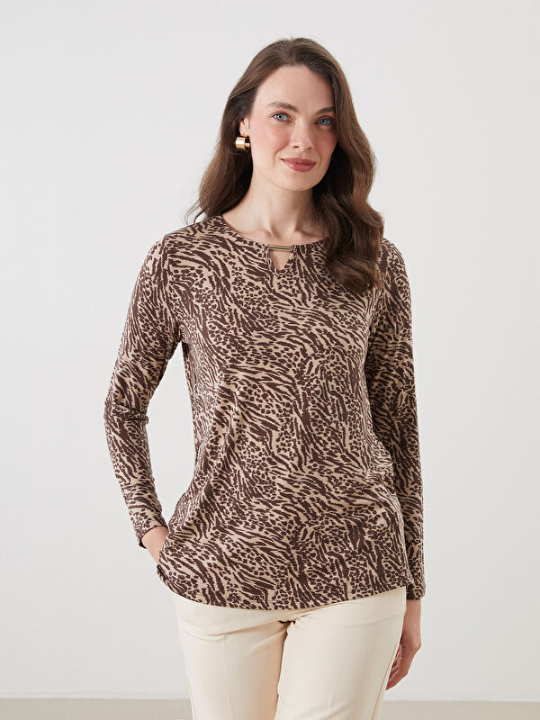 Дөңгелек жағалы өрнекті әйелдер блузкасы