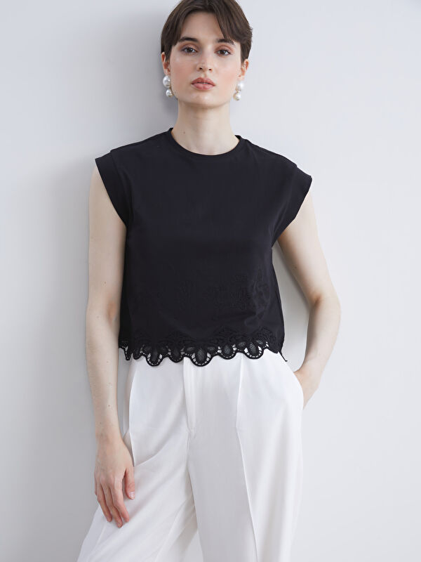 Ойық жағалы кестеленген блузка