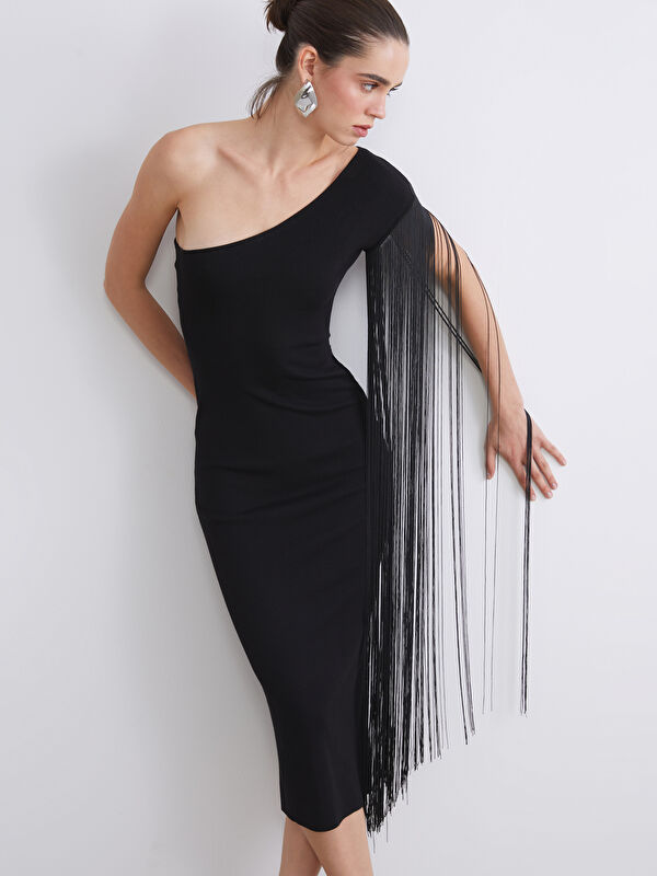 Жартылай биік жағалы трикотаж көйлек
