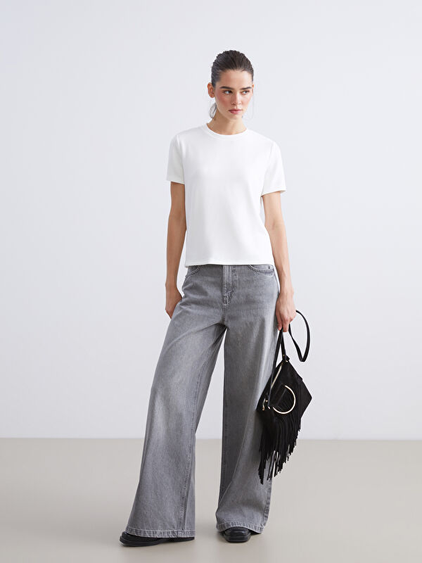 Әйелдерге арналған кең балақ жыртылған детальды джинс шалбар