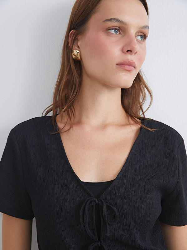 Блузка с узором и коротким рукавом с воротником на завязках для женщин