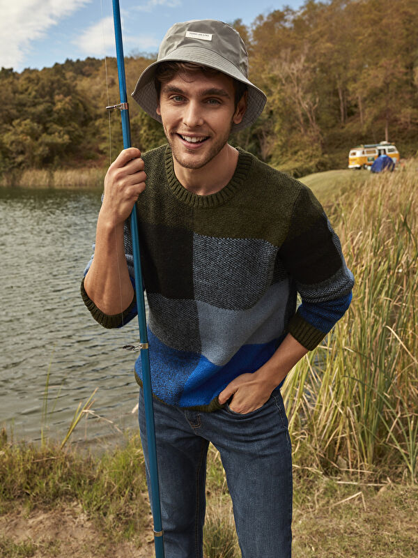 Мужской трикотажный свитер с круглым вырезом и длинными рукавами с цветовыми блоками