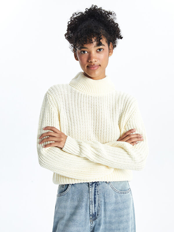 Свитер из трикотажа с воротником-труба и ажурной вязкой для женщин